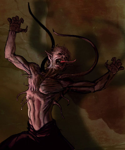 Bear-Izzeth loomed over one of the tall, pale creatures as it clung to the crumbling edge with its thin arms and shoulder-tentacles. It resisted Bale’s attempts to blast it over the side then, without any compulsion to do so, dropped out of sight in a controlled fall. It was running for reinforcements.